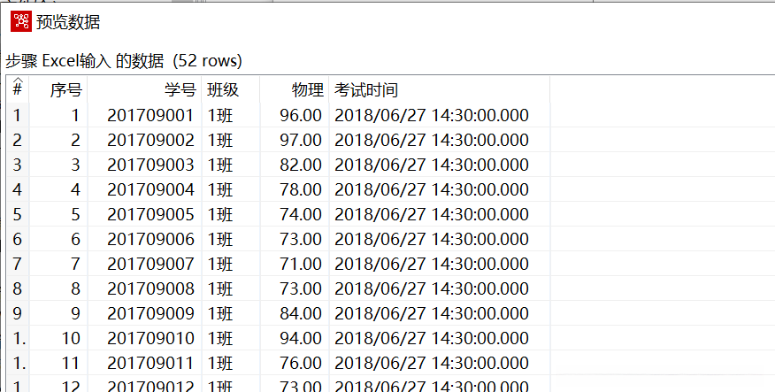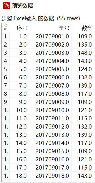 使用Ctrl+N快捷键,创建【排序记录】转换工程。接着创建【Excel输入】组件,设置参数,导入“2019年11月月考数学成绩.xls”文件,预览数据,如图所示,其中“数学”字段数据处于无序状态。