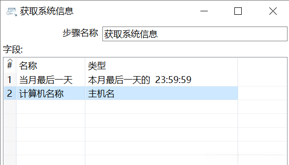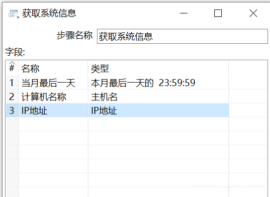 设置第3行参数。与设置第1行参数类似,第3行参数的【名称】参数设置为“IP地址”,【类型】参数设置为“IP地址”,如图所示,此时已完成【获取系统信息】组件的参数设置。