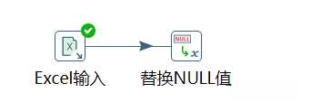 在【替换NULL值】转换工程中,单击【核心对象】选项卡,展开【应用】对象,选中【替换NULL值】组件,并拖曳至右边工作区中。由【Excel输入】组件指向【替换NULL值】组件,建立节点连接,如图 所示。