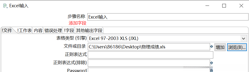 添加并编辑Excel文件。单击【增加】按钮,将浏览导入至【文件或目录】输入框中的“E:\data\物理成绩.xls”文件,添加至【选中的文件】表中,如图所示。