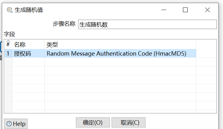 双击生成随机数】组件,弹出【生成随机值】对话框,单击【名称】参数输入框,键盘键入“授权码” ,而后单击【类型】参数输入框,弹出【选择数据类型】对话框,选择【Random Message Authentication Code(HmacMD5)】类型,如图所示。