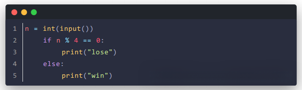 # 获取输入,并转成整数``n = int(input())``# 初始化列表,默认都是-1,表示向前``direction = [-1] * n``# 第1遍报数,注意报数是从1开始的``for i in range(n):` `if (i + 1) % 2 == 0:` `direction[i] = 1``# 第2遍报数``for i in range(n):` `if (i + 1) % 3 == 0:` `direction[i] *= -1``# 第3遍报数``for i in range(n):` `if (i + 1) % 5 == 0:` `direction[i] *= -1`` ``# 输出值为-1是列表项``for i in range(n):` `if direction[i] == -1:` `print(i + 1)