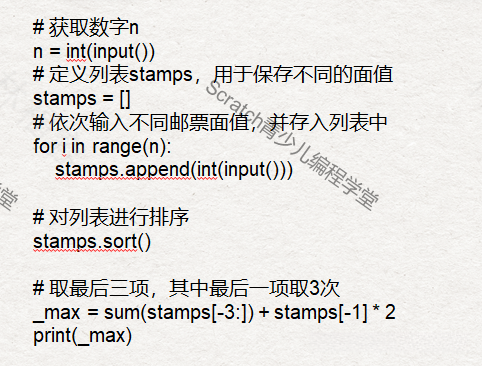 给定任意一个整数n表示不同种类的数量,请依次输入n个具体的数值作为各类邮 stamp的不同面额;每封信最多允许粘贴5枚普通 mail stamp,并且至少需提供3种不同的普通 mail stamp类型;通过计算确定每封信能够组合出的最大可能总金额