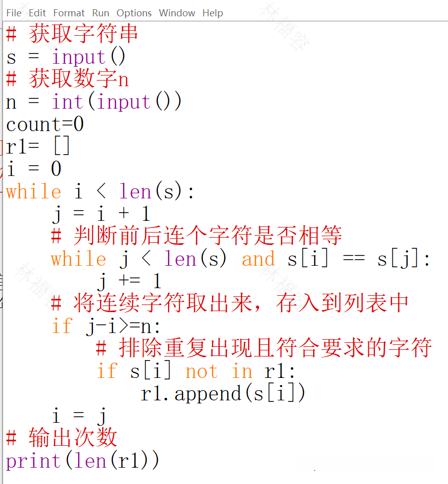 例如输入abbcccdddd,输入2,字符串中连续出现2次的字符包括b、c、d这3种。