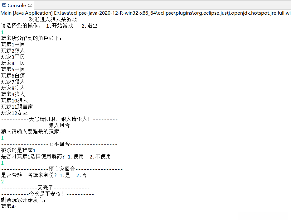 System.out.println("游戏结束,恭喜狼人获得胜利!");