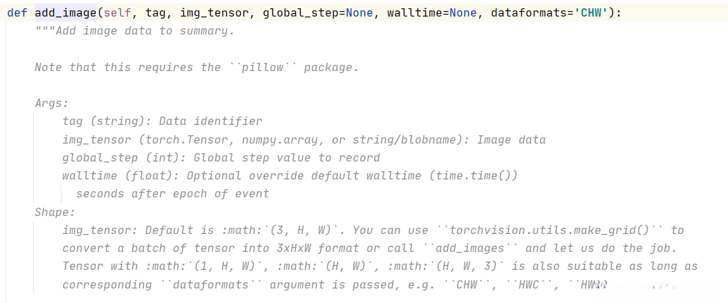 在处理过程中需要注意的是参数img_tensor。该参数要求输入的img可以是torch.Tensor、numpy.array或string类型。通常使用Image.open()读取的图片属于PIL类型,并因此需要将PIL类型的图片转换为适合该参数的要求。此外还需要指定图像的形状(shape),可以通过dataformats设置为'HWC'形式。global_step则表示当前处理的具体步骤,并如果不更换标签(tag),则可以观察到图像处理过程中的变化情况。
