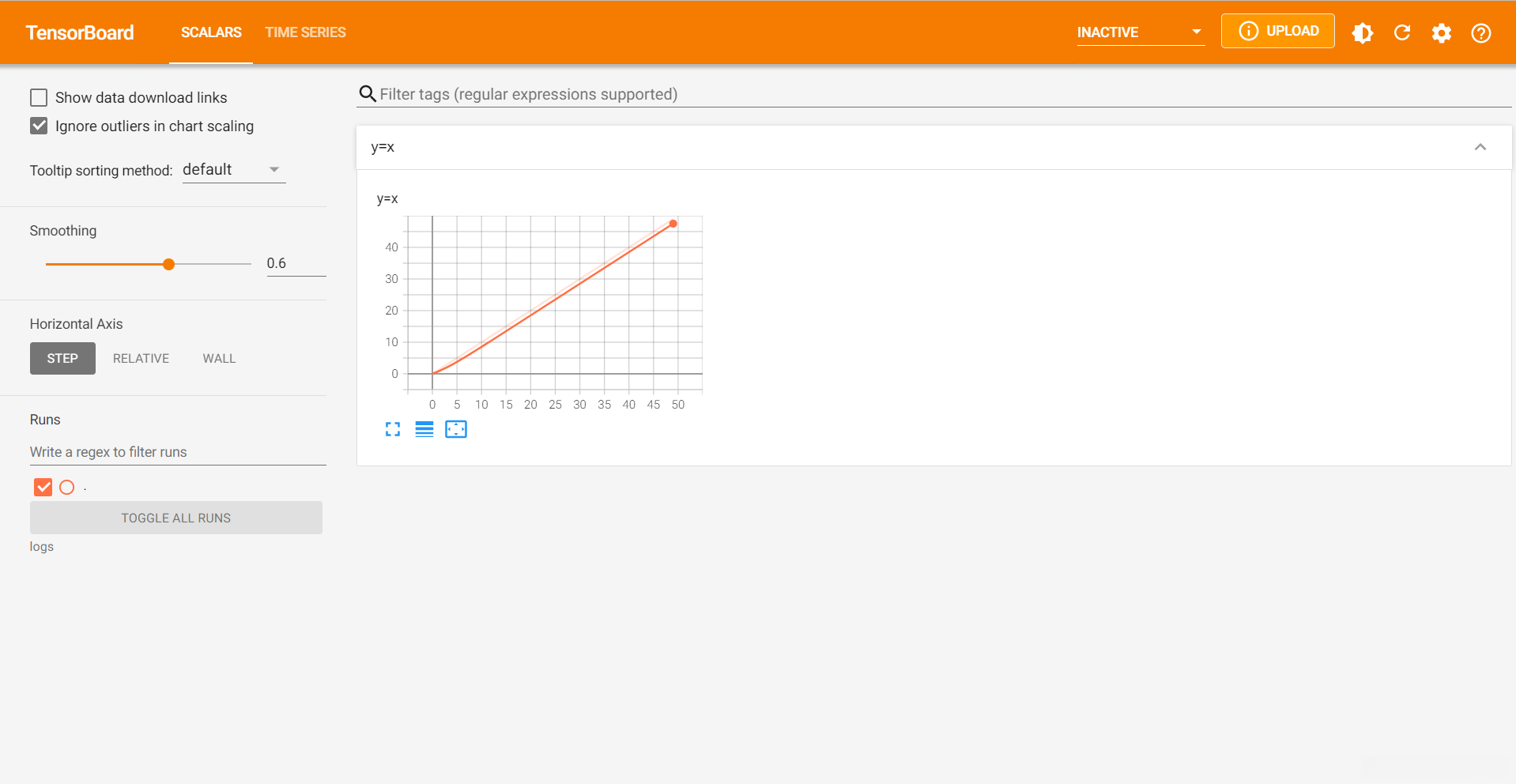 例如下面代码,为在tensorboard上展示y=x的部分: