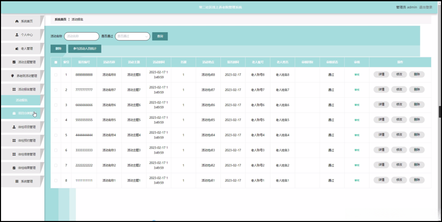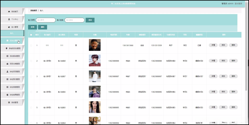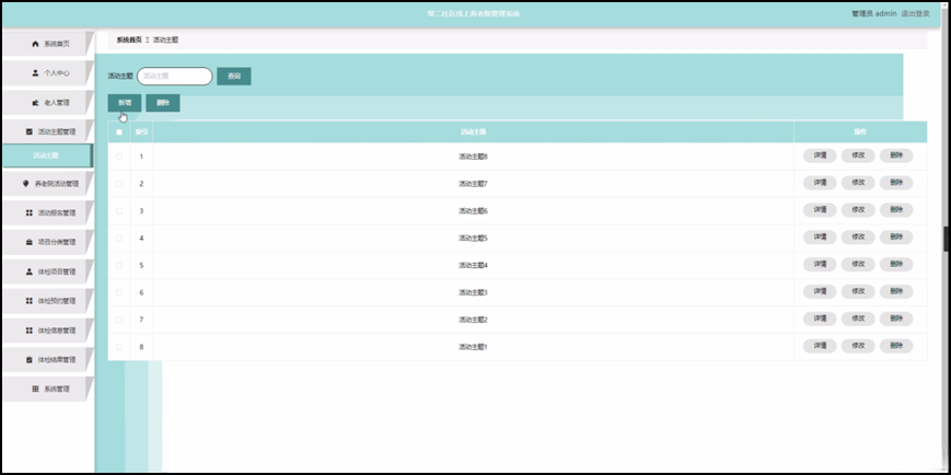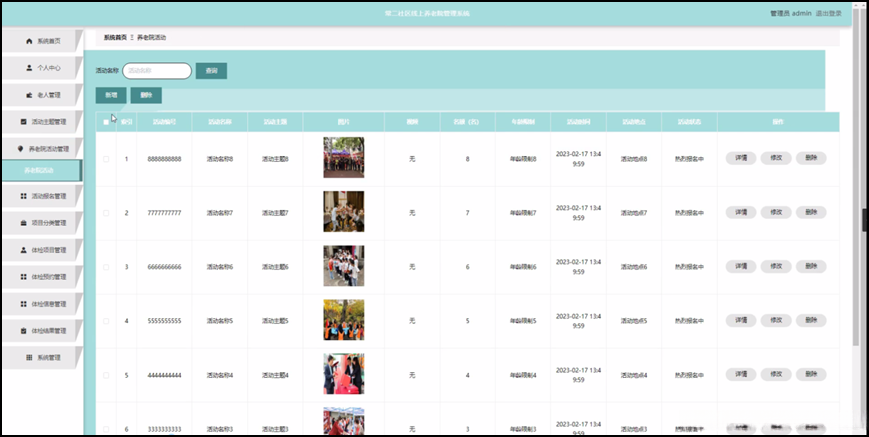 管理员单击"养老院活动管理"按钮进行操作。在养老院活动页面输入活动名称后执行查询、新增或删除操作;随后查看详细信息后可以选择进行详情查看、编辑修改或彻底删除。