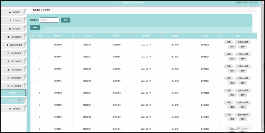 系统管理员通过点击"体检信息管理"按钮进入该功能模块。用户可在该页面输入项目名称以执行查询或删除操作,并根据需要对体检详细信息实施查看(详情)、上传检验报告(上传检验报告)以及数据修改(修改)和记录清除(删除)等功能;如图5-14所示: