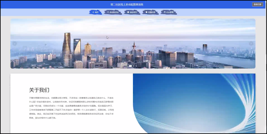 当用户访问该系统的主页链接时,在首次屏幕上即可进入首页界面显示。该界面包含社区线上养老院管理系统的设计与功能分区导航栏,在点击各功能展示区域后将引导至相应操作页面进行交互操作。