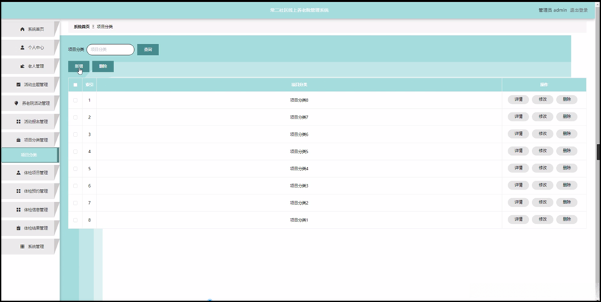 管理员通过点击进行体检项目的管理操作。在体检项目的页面中输入项目名称后,则可实现查询、新增或删除功能,并可依据具体情况执行详细信息的查看、修改或删除操作;如图5-12所示: