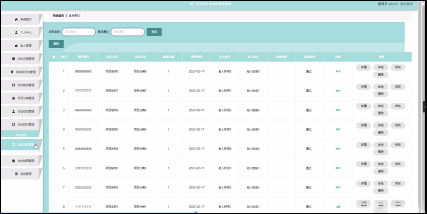 管理员点击“体检预约管理”功能。在该页面中输入项目名称,并勾选“是否通过”以执行查询或删除操作;随后根据具体需求完成信息详情查看、健康检查、数据更新以及记录删除等操作。如图5-13所示: