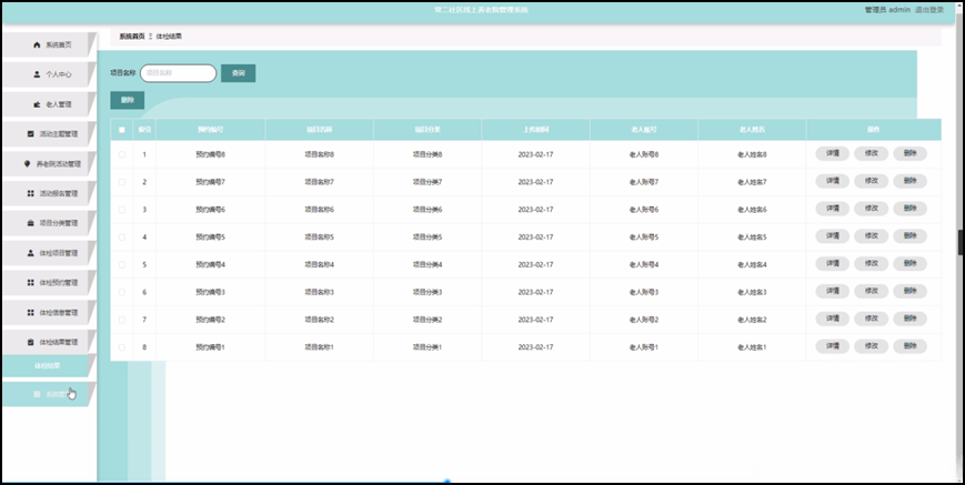 系统管理员点击进入体检结果管理模块,在体检result页面中输入项目名称后可执行查询或删除操作于体检result列表中,并根据具体需求对体检result详细信息执行详情查看、内容修改或信息删除操作;如图5-15所示: