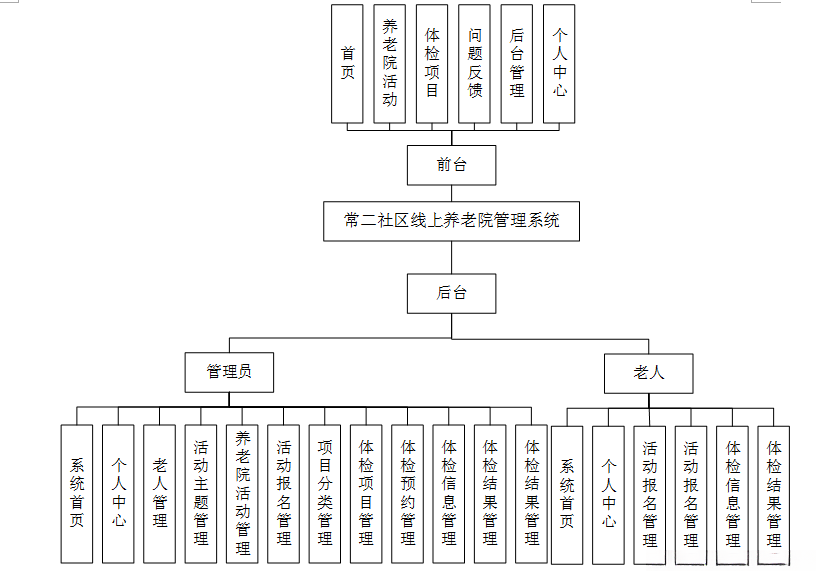 在常二社区线上养老院管理系统搭建过程中,在进行系统分析时,则需要先从整体入手再深入局部。而整个系统的功能需求则是确保所有用户能够方便地进行线上养老信息的记录、查询和更新。同时后台管理人员还需负责对整个系统的后台运行环境进行日常维护。