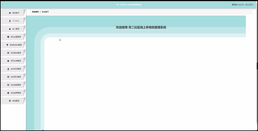 管理员登录至主页,在线系统中拥有多项核心功能模块的操作权限。该模块不仅包含对系统首页信息展示、个人中心配置设置以及老人信息管理系统等功能的访问权限,并且也具备对活动主题管理系统(含养老院活动)、活动报名管理系统等各类业务系统的操作权限。该界面如附图5-6所示: