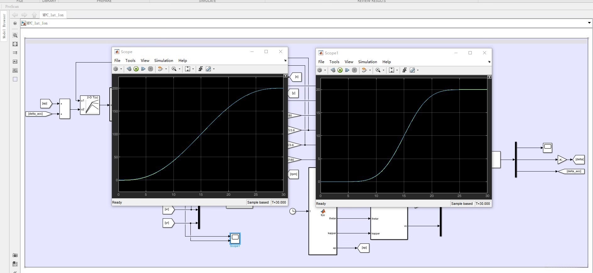 为了验证实现了横纵向耦合控制的自动驾驶车辆的运行效果,我们使用matlab与simulink联合仿真。在纵向控制方面,我们使用已经做好油门刹车标定表的五次多项式曲线作为目标轨迹,通过跟踪目标轨迹来计算出控制输入。在横向控制方面,我们选择了换道轨迹来验证该控制策略的有效性。仿真结果表明,该算法能够完美地控制车辆行驶,并具有较好的鲁棒性和实用性。