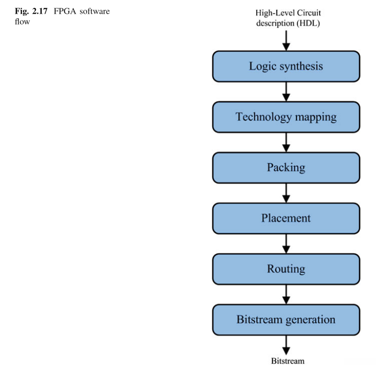 图2.17显示了在FPGA架构上对应用电路进行编程的通用软件流程。这些模块的细节通常与所使用的路由体系结构类型无关,除非另有说明,否则它们适用于前面描述的两种体系结构。