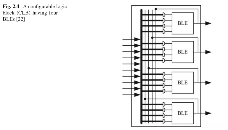 CLB可以由单个基本逻辑元件(BLE)或本地互连的BLE集群组成(如图2.4所示)。图2.4显示了一组4个BLE;每个BLE包含一个LUT-4和一个触发器。