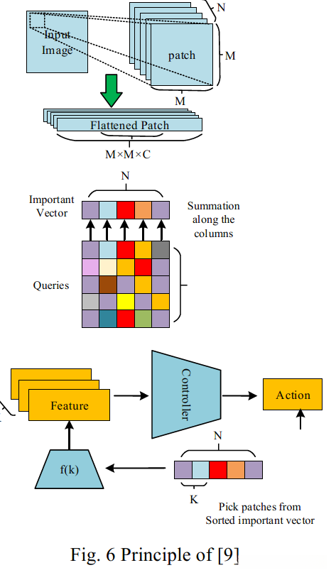 为了实现这一点,[9]将输入图像分割成几个块,然后基于改进的自我注意体系结构模拟块之间的投票,从而选择一个被认为是重要的子集。在每个时间步中选择相关的块,一旦确定,AttentionAgent将只根据这些块做出决策,而忽略其他块。通常,反向传播被用来优化神经网络但是考虑到Attention Agent包含了不可微的操作,如排序、切片等来生成重要的块,将这些技术应用到训练中并不容易。因此,采用非导数优化算法来克服这一问题,如图6所示。