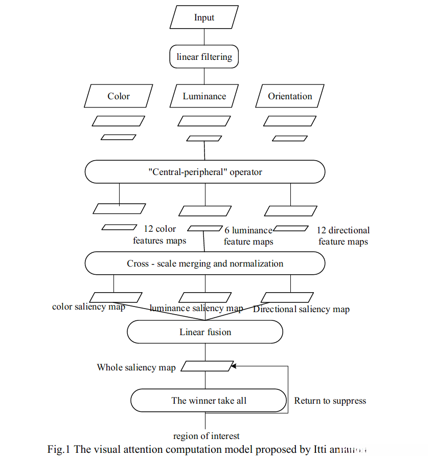 如图1所示,该模型分为两个部分:显著图的计算以及 attention 区域的选择和转移。显著图计算的核心是每个通道特征的提取和融合策略,这也是整个模型框架的核心。首先,将输入图像分解为彩色、亮度和方向三个多通道图像分量,并建立多分辨率金字塔来表达每个分量。然后,利用模拟人类感官场特征的“中心-外围”算子对多尺度分量图像进行操作,得到12幅颜色特征图、6幅亮度特征图和24幅方位特征图。然后通过归一化线性重叠得到相应的颜色、亮度和方向显著图,并根据这三种不同通道的显著图生成总显著图。最后,通过人工构建的动态神经网络通过显著图选择注意区域。选择的区域是一个以关注焦点为中心的圆,显著图中值较大的点将首先被注意到。