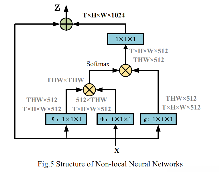 为了实现每个像素级预测的全局参考,Wang等人在CNN中提出了非局部的 self-attention 神经网络,如图5[8]所示。他们的方法是将每个像素视为一个基于像素间预测协方差的随机变量。参与的目标像素是所有像素值的加权和 ,其中权重是每个像素与目标像素之间的相关性。利用 self-attention 机制,在模型的训练和预测过程中实现全局参考(global reference)。该模型具有较好的偏方差权重(bias-variance weight),使模型更加合理。