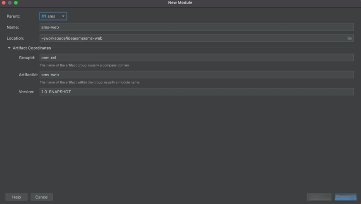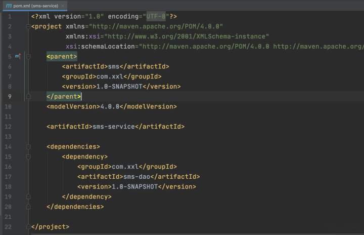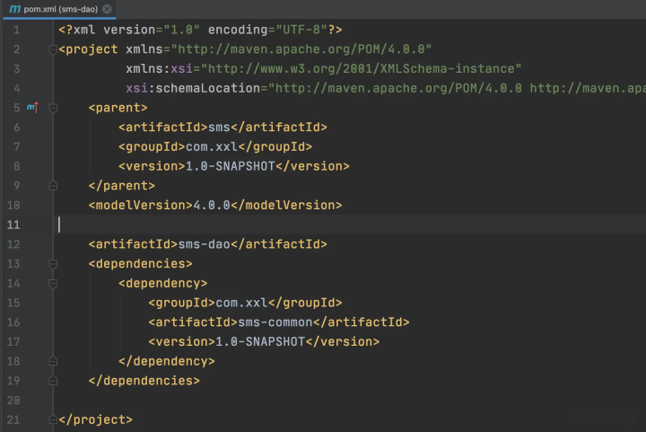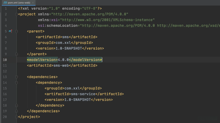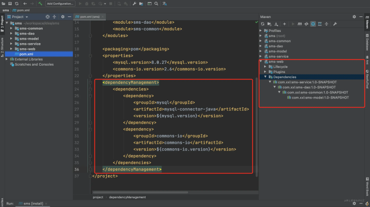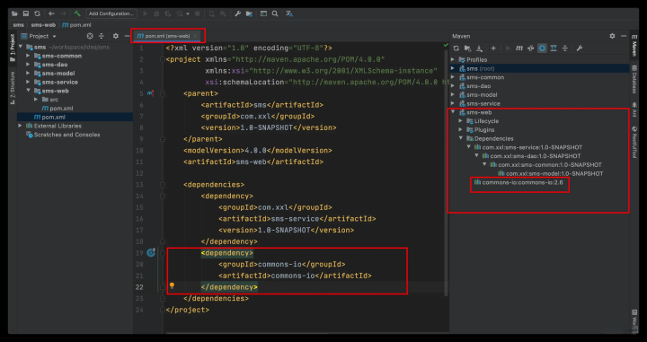 如果 module named sms-web 需要引用 commons-io 库,在它的 pom.xml 文件中的 dependencies 属性中添加该库的位置信息即可。