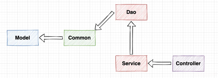 在项目环境中,我们可以观察到 service 需要依赖于 dao 的存在。这些关键组件包括 model 实体类作为基础架构。其中 dao 和 service 都需要用到 common 这一核心组件。尽管如此,在项目架构中我们无法为这三个组件中的每一个都增加 model 的额外依赖关系;然而,在服务层(如 dao 和 service)中添加 common 这一公共组件则是可行的。