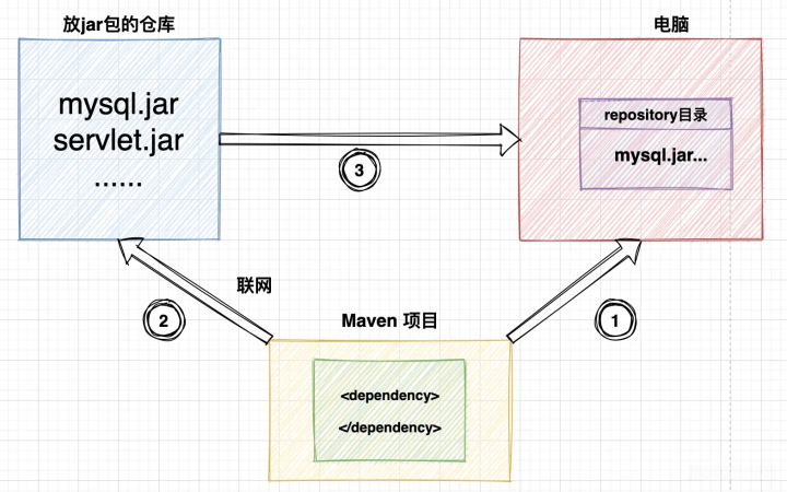 如果未能找到所需的依赖项,Maven会依据依赖项的位置从中央仓库将 jar 包移动至本地存储位置