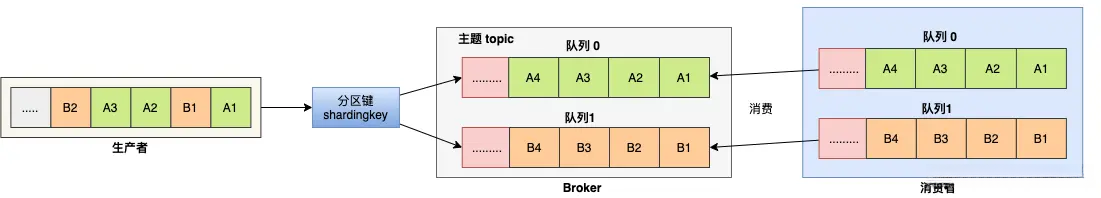 对于普通类型的消息,默认情况下可能会被分散至不同的队列中,在这种情况下各队列中的消息无法保证传递顺序。相反,在使用顺序模式时,RocketMQ能够实现具有相同Sharding Key属性(如同一订单号)的消息序列集中分配至同一个队列。