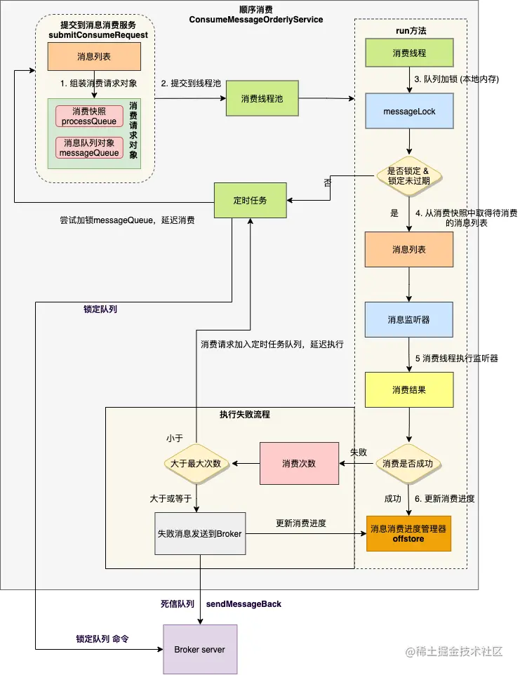 消费者基于分配的消息队列 messageQueue ,向 Borker 获取锁权限 ,当获得锁权限时会拉取消息 ,若未能获取,则定时任务每隔20秒将重新尝试