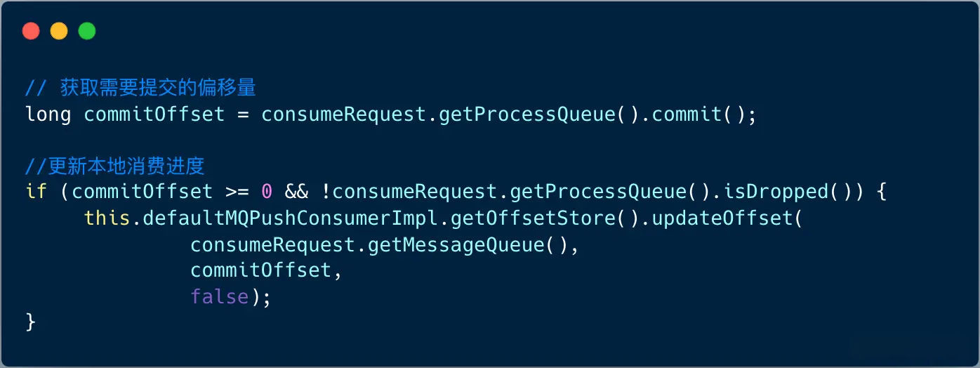 消费成功时,首先计算需要提交的偏移量,然后更新本地消费进度。
