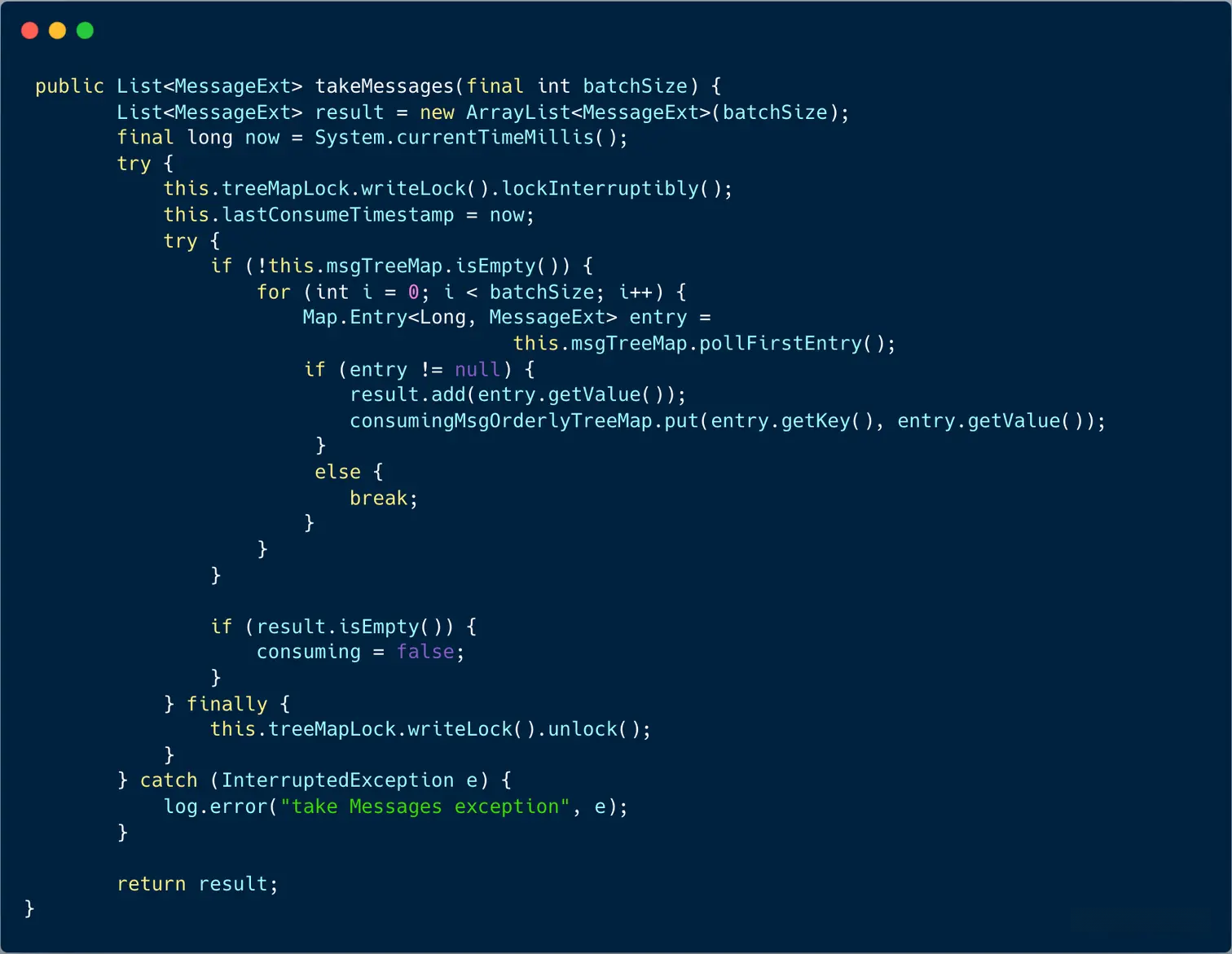 在消息处理队列中,该功能模块初始化了一个名为 consumingMsgOrderlyTreeMap 的红黑树数据结构,用于暂存待处理的消息。