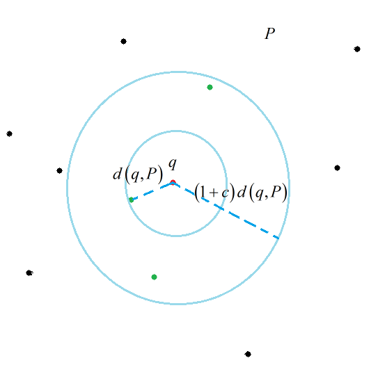 定义 2: 给定一拥有个点的点集,在点集中寻找点p,这个满足d(q,p)≤(1+c)d(q,P),其中d(q,P)是中距离点最近一点到的距离。