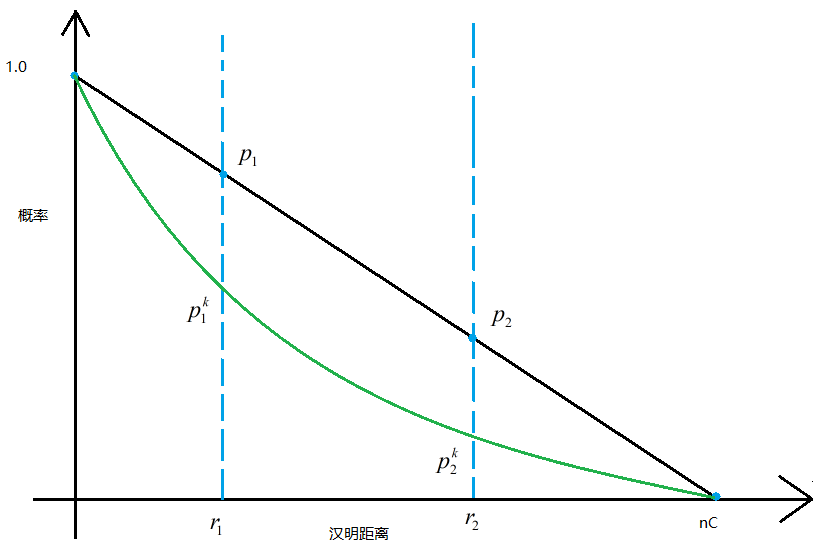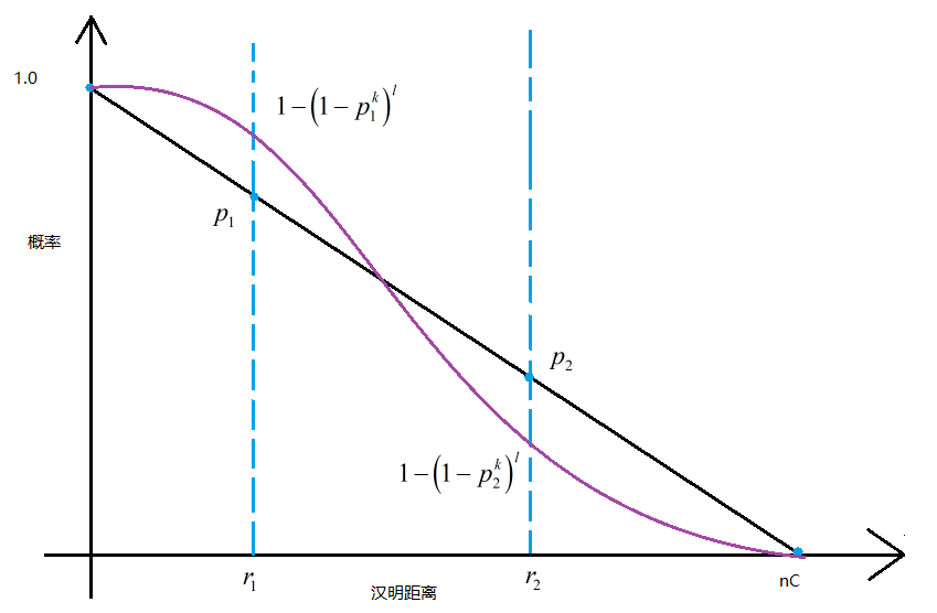 接下来需要讲的就是哈希函数的组合判断。试想如果nC确定了,在不同的距离下的概率就被确定了。有时候我们发现对于一些比较接近的,我们很难区分开来。这个时候我们就要放缩相关的哈希概率。放缩概率的手段比较简单,通过增加哈希表的数量来增加哈希概率,在同一张哈希表中增加哈希函数可以缩小哈希概率。我们通常用l表示哈希表的数量,用k表示每个哈希表中哈希函数的个数。