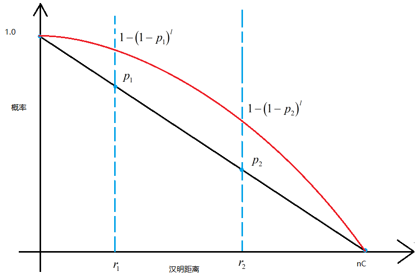 对于这个哈希函数我们可以发现若,的曼哈顿距离为d,则他们被哈希成相同哈希值的概率为Pr_H[h(q)=h(p)]=\frac{nC-d}{nC},从而这个哈希函数是具有(r_1,r_2,\frac{nC-r_1}{nC},\frac{nC-r_2}{nC})敏感性的。这个应该很容易理解。需要说明一下的是,这个哈希的方式准确的说应该是针对汉明距离的。然而我们刚刚其实耍了一个小聪明,把曼哈顿距离转换成了汉明距离。真正针对曼哈顿距离下的LSH将会在几年后的一篇论文中与欧式距离下的LSH同时被提出。