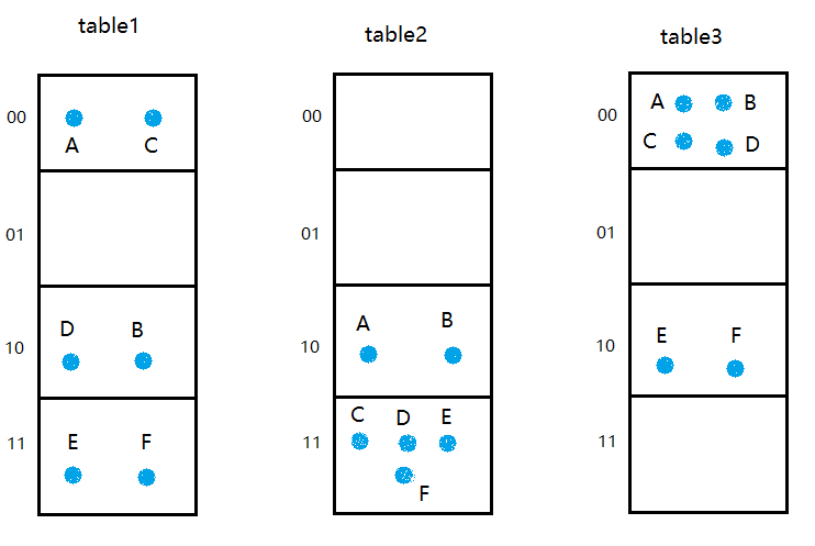 若此时我们的查询点q=(4,4),可以计算出g_1(q)=[1,1]^T,g_2(q)=[1,1]^T,g_3(q)=[1,1]^T。则分别取出表1,2,3的11,11,11号哈希桶的数据点与比较。依次是C,D,E,F。算出距离最近的点为F。当然这个例子可能效果不是很明显。原始搜索空间为6个点,现在搜索空间为4个点。对于刚接触LSH的人会有个疑问。如果不同哈希表的数据点重复了怎么办,会不会增加搜索空间的大小。首先要说的是这个概率很小,为什么呢。试想假设两个不同哈希表的哈希桶对的查询有相同点,这意味着在两张哈希表中这个点与都有相同哈希值。如果使用单个哈希函数和此点被哈希到一起的概率为。则刚才那个事件发生的概率为p_0^{2k},这个概率是很小的。当然也有很多办法可以解决这个问题。这不是一个大问题。我在实际运用时大概总是取10-20之间的数,大致20-100左右。每次对进行候选点匹配时,候选的样本点数量已经是的十分之一到百分之一了。就好比有10000个数据点,使用暴力匹配要遍历整个数据集,使用LSH可能只要匹配100到1000个点就可以了。而且往往我都能找到最近点。即使找不到最近的,总体成功率也在90%-98%左右。