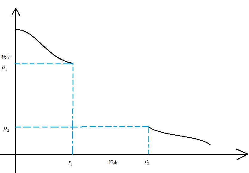 可以看出这个定义其实是更关注与两个部分的概率。从定义的角度上并没有说概率随着距离的变化一定要单调。但事实上目前所有的LSH哈希函数都是单调的。这也是我困惑的一点。