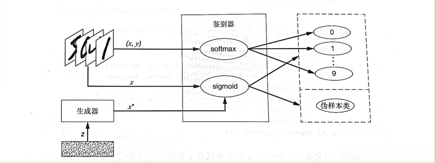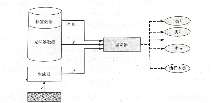生成器负责将随机噪音转换为伪样本;鉴别器接收有标签的真实图像(x,y)、无标签的真实图像(x)以及生成器生成的伪图像(x*)。首先使用sigmoid函数区分真伪,接着采用softmax进行类别划分。