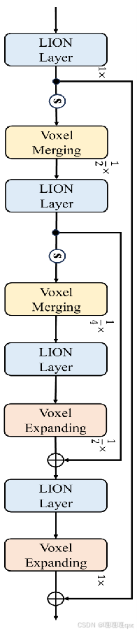 该网络架构整合了三维主干、鸟瞰图主干以及检测模块,在三维空间中对关键点进行高效捕捉。如图所示, 其主体结构由多个独立的LION模块构成(实现跨尺度特征融合)。通过连续迭代每个LION块, 完成局部区域特征提取(强化关键点描述), 然后通过系统性降维处理对各层提取的高度信息进行整体优化