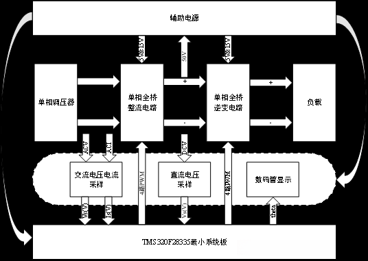 系统主要采用单相PWM整流电路与单相逆变电路作为主电路拓扑结构,主控芯片选用TMS320F28335。系统框架结构示意图如图2所示。交流输入电压为30V,输入电流为2A,其中PWM整流器负责负载特性模拟,逆变器承担能量反馈功能。