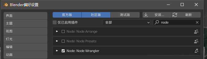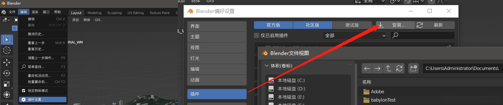 Blender中安装插件,进入【编剧】à【偏好设置】à【插件】à【安装】,选中下载好的压缩包,即完成了插件的安装。