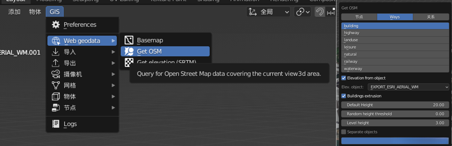 点击【GIS】à【Web geodata】à【Get OSM】生成建筑物的模型。
