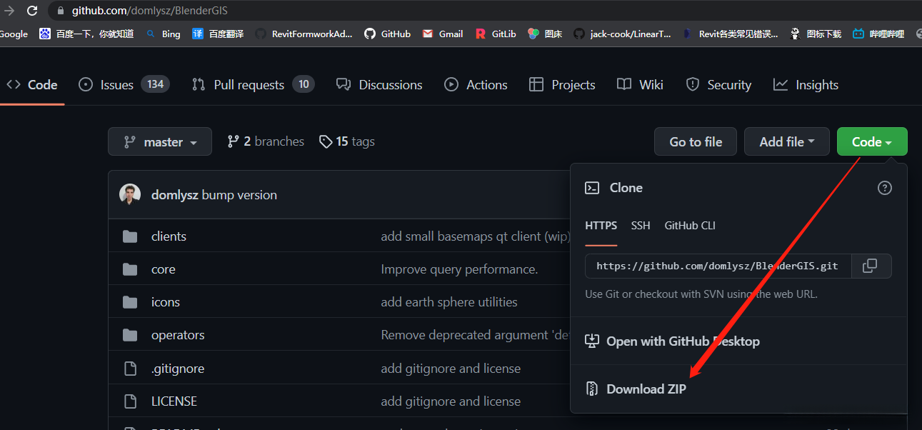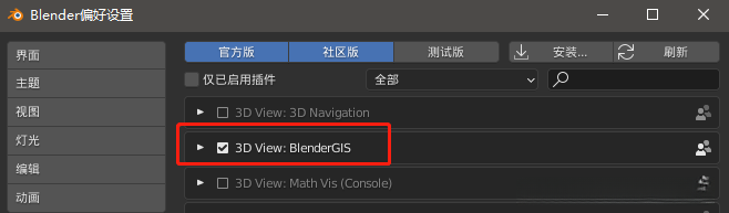 下载并安装Blender-gis插件,下载地址GitHub - domlysz/BlenderGIS: Blender addons to make the bridge between Blender and geographic data,下载Zip包即可,不需要解压。进入Release页面可以下载历史版本。