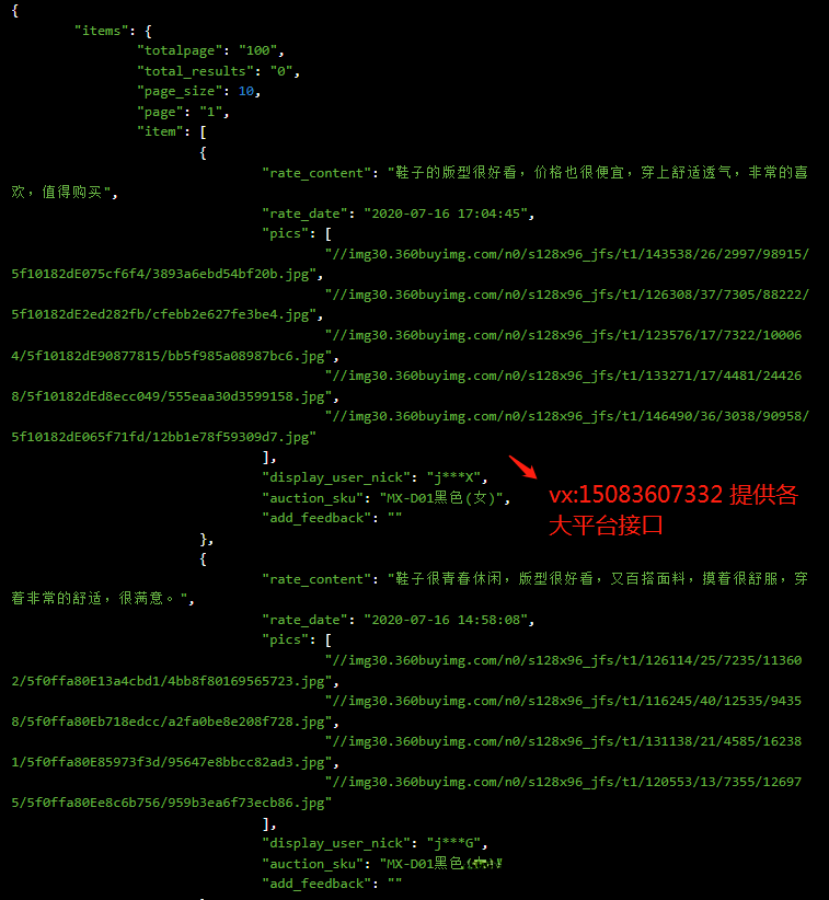 当访问接口时,必须提供商品ID作为参数传递给接口。该接口会返回包含评论数据的JSON格式信息,并且包括了详细的评论内容、创建时间以及相关的图片等内容。