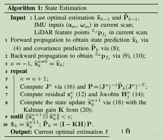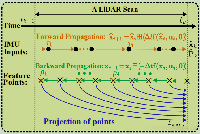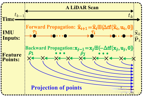 重置状态(如速度和偏置) 。反向传播是以特征点的频率进行的,这通常远高于IMU速率(如果使用固态雷达则频率,则频率远高于IMU)。对于在两个IMU测量之间采样的所有特征点,我们使用左IMU测量作为反向传播的输入。此外,注意到公式(3)中的