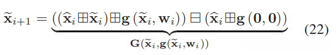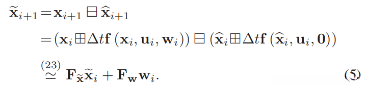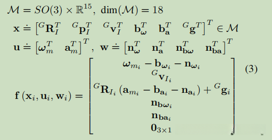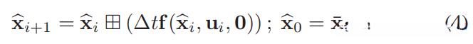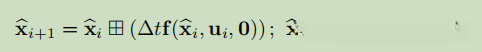 x_{i+1}=x_i \, \boxplus(\Delta t f(x_i,u_i,w_i)) ....(2)