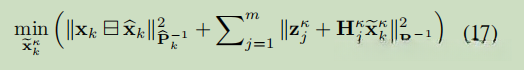 ,用式(15)带入式(17), 优化得到的二次代价得到标准迭代卡尔曼滤波器[21],可以在下面计算(为了简化符号,m为观测特征的数量