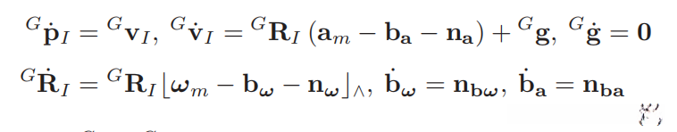 其中G表示全局坐标系,即第一帧的IMU坐标系。g为未知的重力加速度向量表示在G坐标系中,a和\omega为IMU的测量值,n为IMU测量值的高斯白噪声,b为IMU的bias我们建模为高斯随机游走,