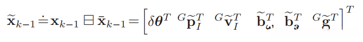 其中\delta\theta=Log(^G\bar{R}_I^T^GR_I)是姿态误差,剩下的误差均为标准相加误差,估计的误差为如