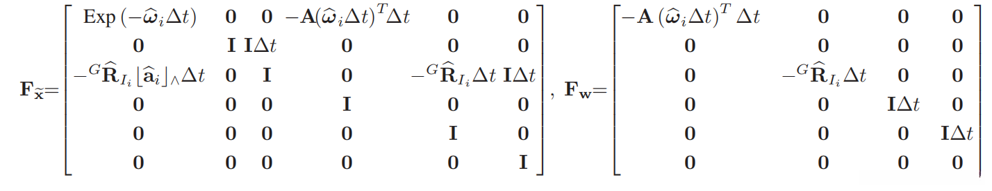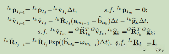 在接收到IMU输入后,就将执行正向传播,更确切的说,状态的前向传播是将(2)式的噪声设置为0,认为没有噪声